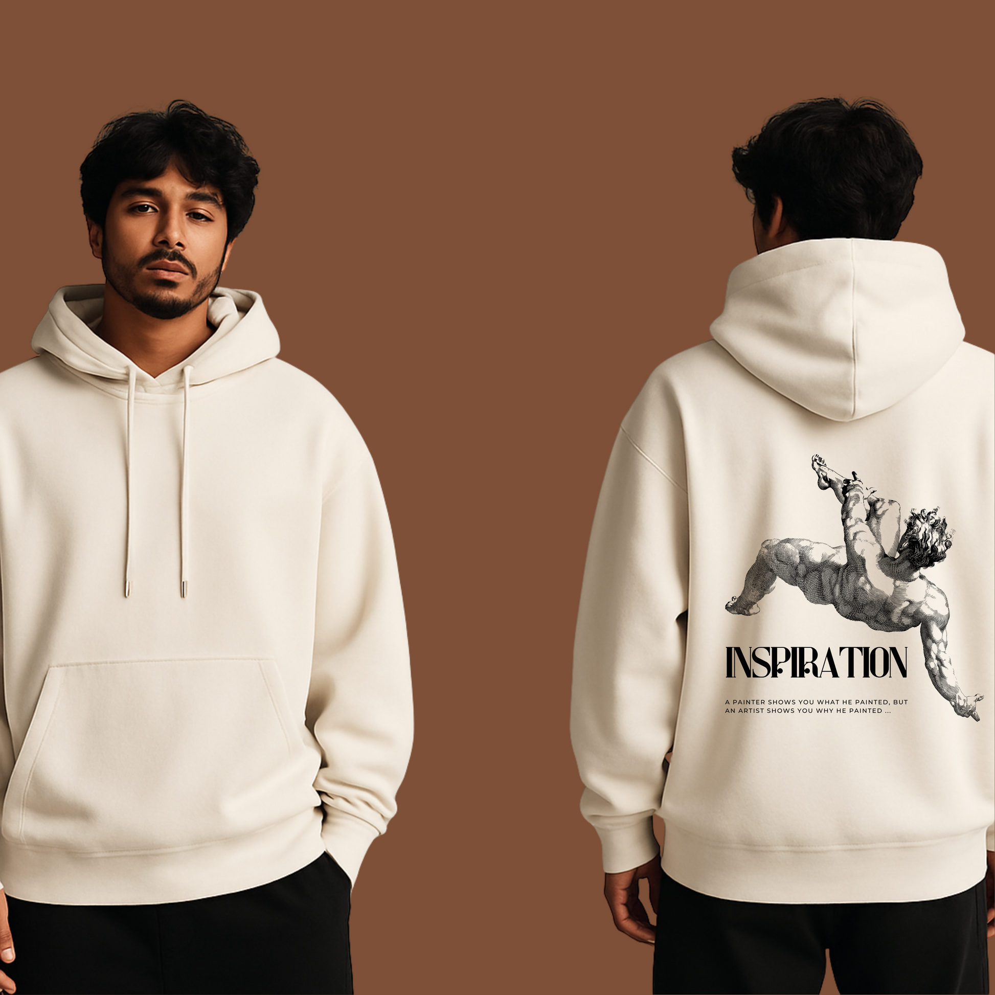 Crafted from premium 400 GSM fabric, the Inspiration off-white hoodie delivers exceptional comfort and durability. Its oversized fit ensures a relaxed, casual silhouette, while the bold back print adds a distinctive edge to your everyday style. Ideal for layering or standalone wear, this hoodie combines quality with contemporary design for versatile urban appeal.